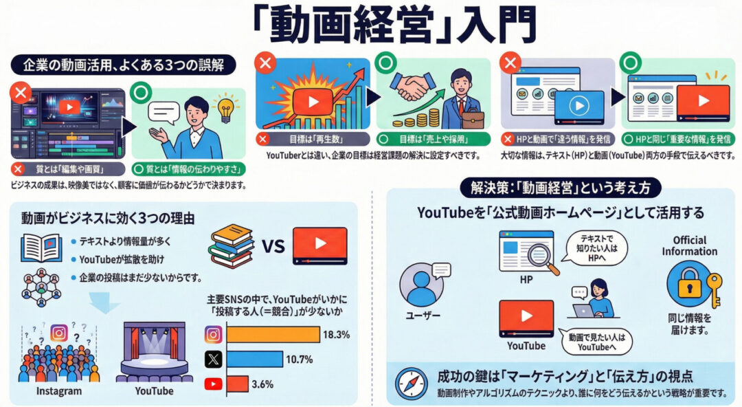 企業の動画活用はYouTubeからの広告収益ではなく、企業の課題を動画を活用して解決する戦略。「公式ホームページ」の情報を動画化し、YouTubeを「公式動画ホームページ」に