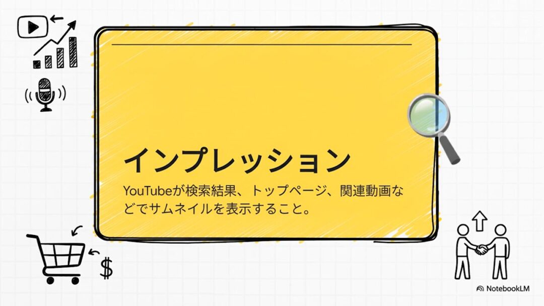 これは、YouTubeがあなたの動画のサムネイルを検索結果や関連動画、オススメ欄に表示した回数のこと😌